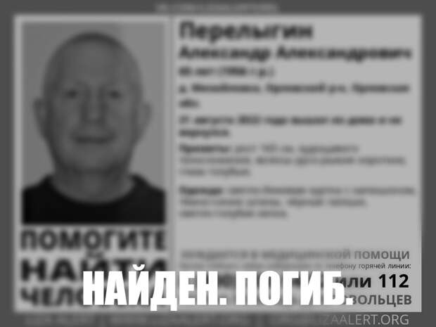 Житель Орловского муниципального округа Александр Перелыгин найден погибшим. Об этом сообщил поисковый отряд «ЛизаАлерт» Орловской области ВКонтакте.