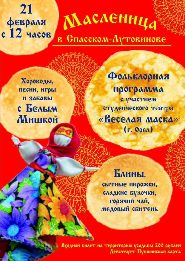 Альтернативой масленичных гуляний в центре Орла станет праздник проводов зимы в Спасском-Лутовинове. 21 февраля, в канун Прощёного воскресенья, в Музее-заповеднике И.С. Тургенева пройдут масленичные гуляния.