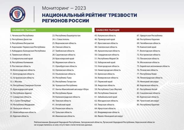 Отметим: Федеральный проект «Трезвая Россия» на протяжении десяти лет ежегодно проводит экспертно-аналитическое исследование последствий потребления алкогольной продукции в каждом субъекте РФ. По результатам исследований ежегодно с 2015 года подготавливается независимый доклад «Национальный рейтинг трезвости субъектов РФ».
