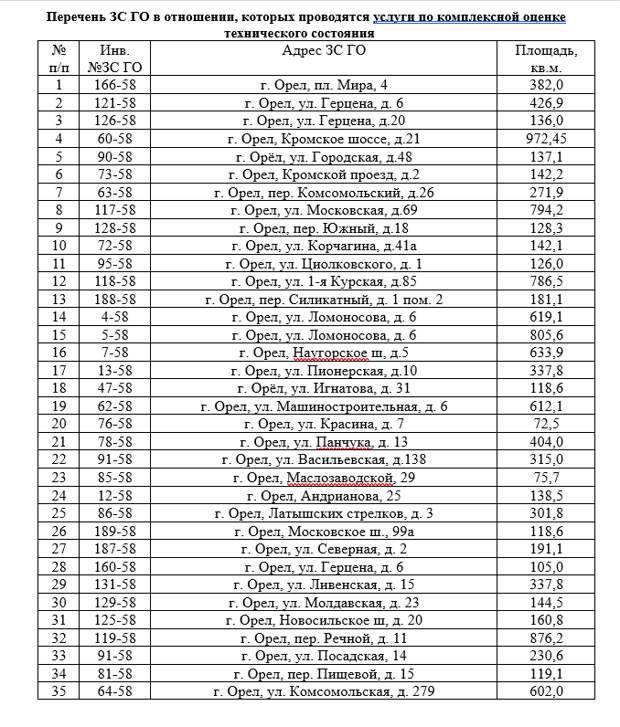 Среди них, например, есть здание гостиницы «Орёл» на площади Мира,4, здание завода имени Медведева и другие.Судя по контракту, самым большим по масштабам защитным сооружением является помещение, находящееся по адресу: Кромское шоссе, 21. Его площадь составляет 972,45 кв.метра.