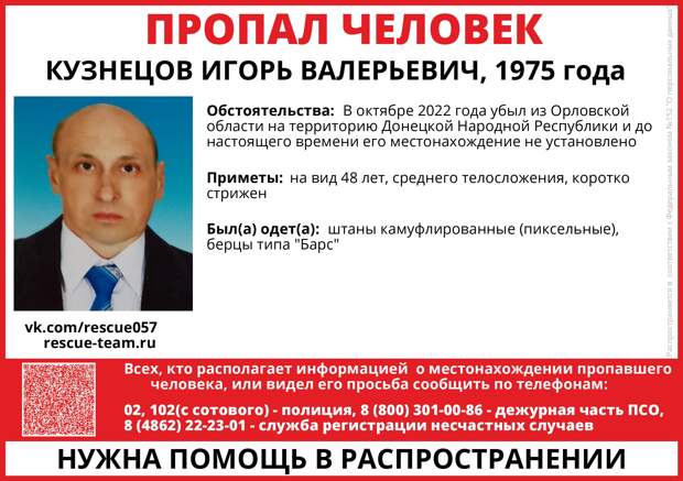 Поисково-спасательный отряд «САРМАТ» опубликовал в соцсетях ориентировку на Игоря Валерьевича Кузнецова 1975 года рождения. Мужчина в октябре 2022 года убыл из Орловской области на территорию Донецкой Народной Республики и до настоящего времени его местонахождение не установлено.
