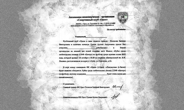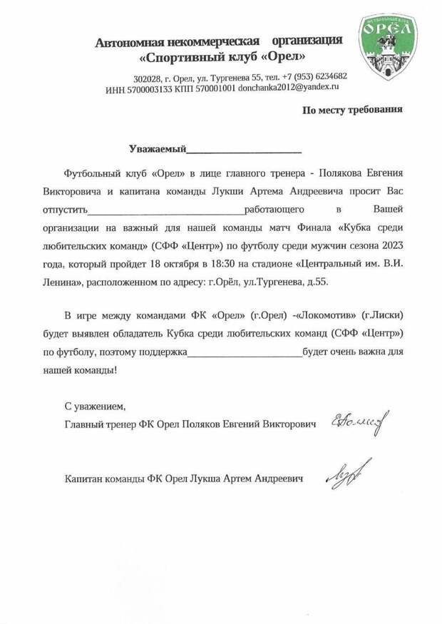 «Футбольный клуб «Орёл» в лице главного тренера — Полякова Евгения Викторовича и капитана команды Лукши Артёма Андреевича просит Вас отпустить работающего в Вашей организации на важный для нашей команды матч…», — указано в письме.