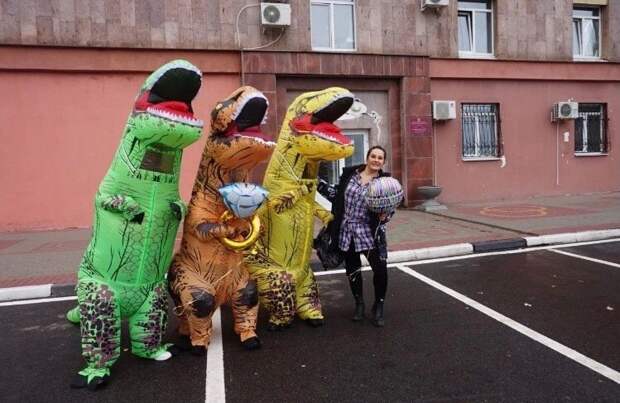 Накануне, 21 октября, в орловском ЗАГСе состоялась необычная церемония регистрация брака. Вместо мужчины и женщин кольцами и клятвами верности обменялись… два огромных динозавра. Молодожёны решили отказаться от стереотипной росписи в свадебном платье и костюме. Невестой оказалась известная орловская зоозащитница, руководитель организации помощи животным «Кот и Пёс» журналистка Виталия Румянцева.