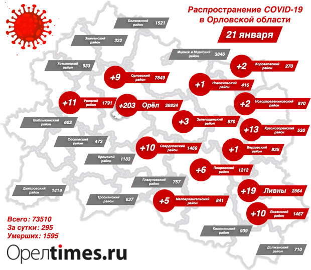 Коронавирус в Орловской области вновь набирает обороты. За минувшие сутки положительные тесты на Covid-19 получили 295 человек. Общее число заболевших ковидом в регионе за всё время пандемии, по данным федерального оперштаба, достигло 73510 человек.