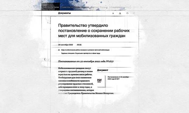 Сегодня, 16 ноября, по поручению президента Путина правительство России оперативно выпустило постановление, гарантирующее мобилизованным с 21 сентября 2022 года гражданам сохранение рабочих мест.