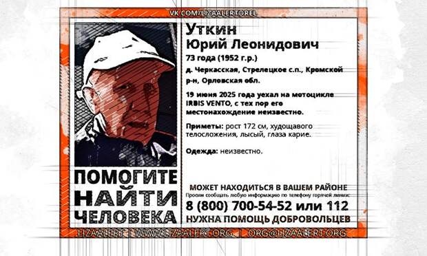 Как ранее сообщали в поисковом отряде «ЛизаАлерт» Орловской области, орловец уехал из своего дома в деревне Черкасская Кромского района на мотоцикле IRBIS VENTO и с тех пор не выходил на связь.