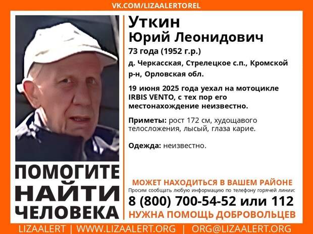 В Кромском районе Орловской области продолжаются поиски 73-летнего мотоциклиста Юрия Уткина. Его местонахождение не удаётся установить с 19 июня.