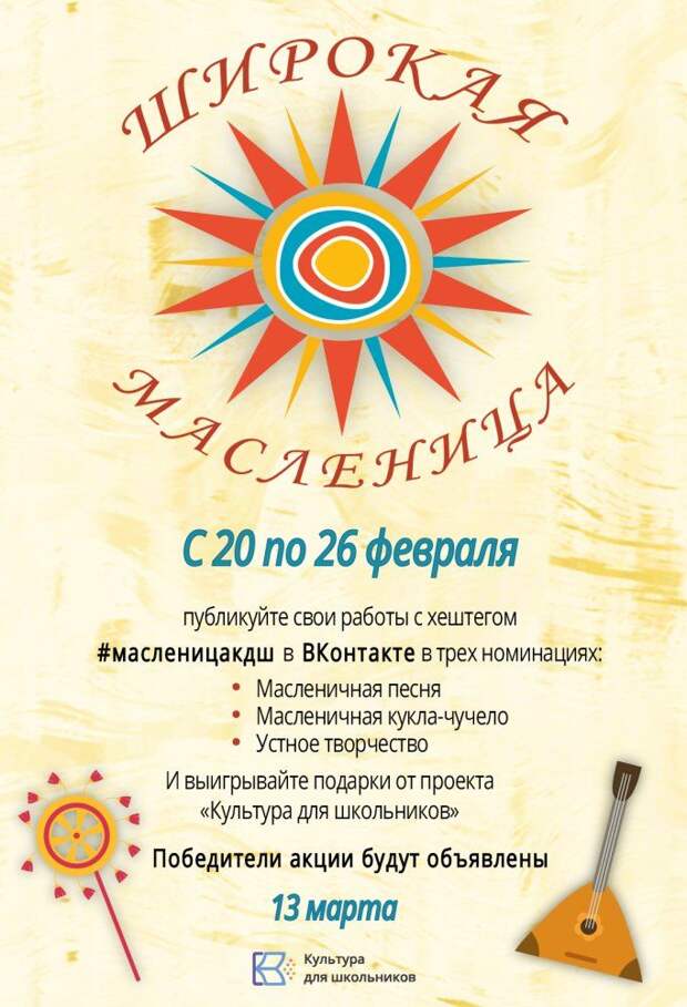 опубликовать на своей странице (или родителя, педагога, учреждения) с хештегом #масленицакдш в «ВКонтакте»;