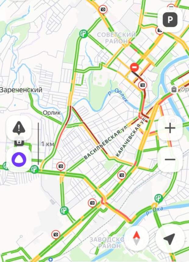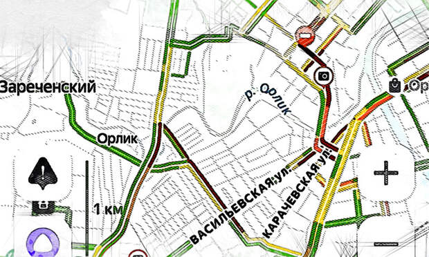 Рассмотрим иной вариант: пунктом отправления на работу, расположенную на ул. Полесской, стал Зареченский микрорайон. Можно было бы рискнуть и поехать через Мостовую, далее по Генерала Родина, Цветаева, Наугорскому шоссе с прибытием в конечном итоге в пункт назначения. Но сегодня утром пробка на «Заречке» начиналась аккурат от выезда из микрорайона. Багровая полоса на навигаторе сразу подсказала, что даже соваться на Мостовую не стоит.