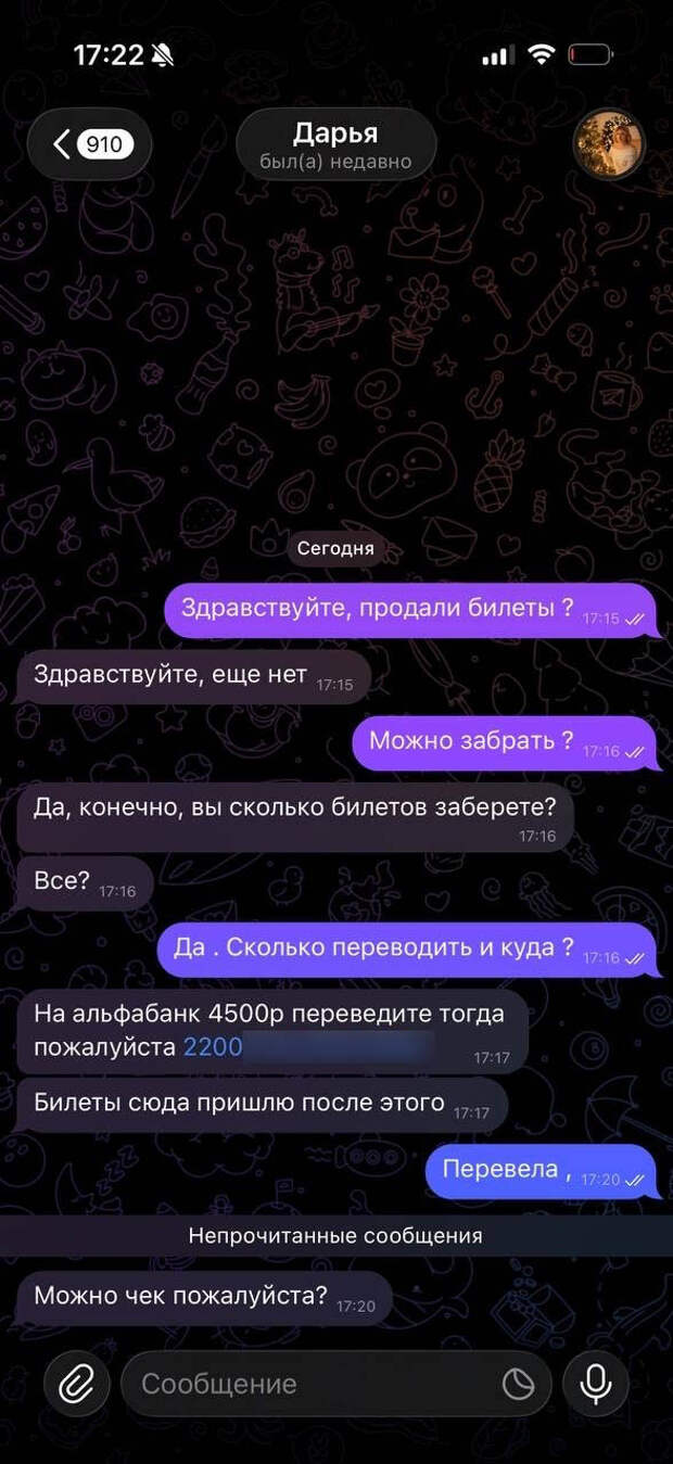 Здесь пристраивают билеты в орловские театры, куда практически не попасть, а также в кино, в СПА-центры и в другие места досуга. Механизм работы чата прост: кто-то купил билет, например, в театр, но не смог пойти на спектакль, и он сообщает об этом участникам группы. Дальше – кто не успел, тот опоздал. Люди списываются друг с другом и договариваются о продаже – всё просто. И до 27 января никаких казусных ситуаций не происходило.Однако во вторник в чате появилась пользователь под именем Дарья, который предложил к покупке три билета на мюзикл «Яга». Желающих нашлось порядка десятка. Большая их часть впоследствии оказались и без денег, и без билета. Люди перевели требуемую сумму, а электронных билетов так и не дождались. Причём как пишут сами пострадавшие, мошенник им сообщал счета в разных банках.