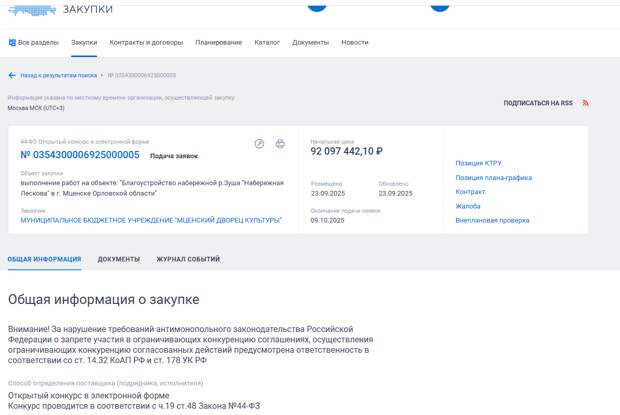 Начальная (максимальная) цена контракта по-прежнему составляет 92,097 млн рублей. Повторные торги, согласно сайту «Госзакупок», были объявлены 23 сентября.