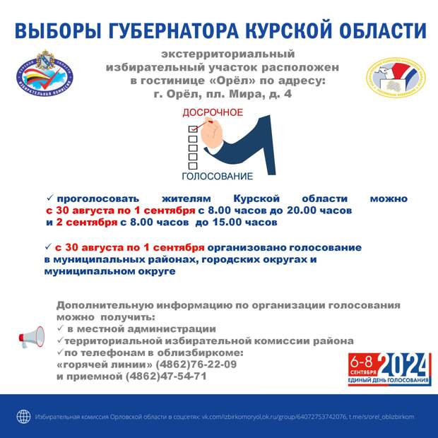 «Дополнительную информацию по организации голосования можно получить в местной администрации, территориальной избирательной комиссии района и в облизбиркоме: по телефонам «горячей линии» 4862762209 или приёмной 4862475471», – сообщили в администрации города Орла.